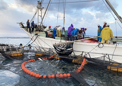 漁獲物の高付加価値化を図る為、夏のマグロを生簀に活かして冬まで餌を与え太らせて出荷する短期畜養事業、養殖業者向けに曳航生簀によりマグロの活魚による洋上販売、また港近くに生簀を設置しブリ等を活魚運搬船で生簀に一時保管し魚価の低下を抑え任意のタイミングで販売する出荷調整事業を行い差別化を図る為に乗組員や陸上社員によって一尾ずつ活締めをしての出荷に取り組んでいます。またCO2排出削減の為、所属船全船減速航行に取り組んでいます。
